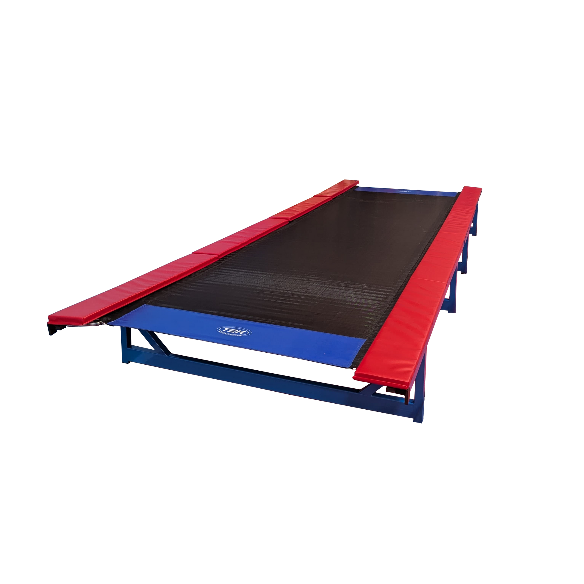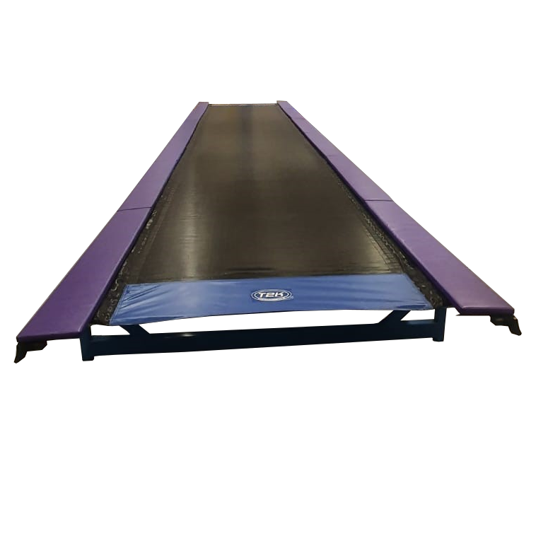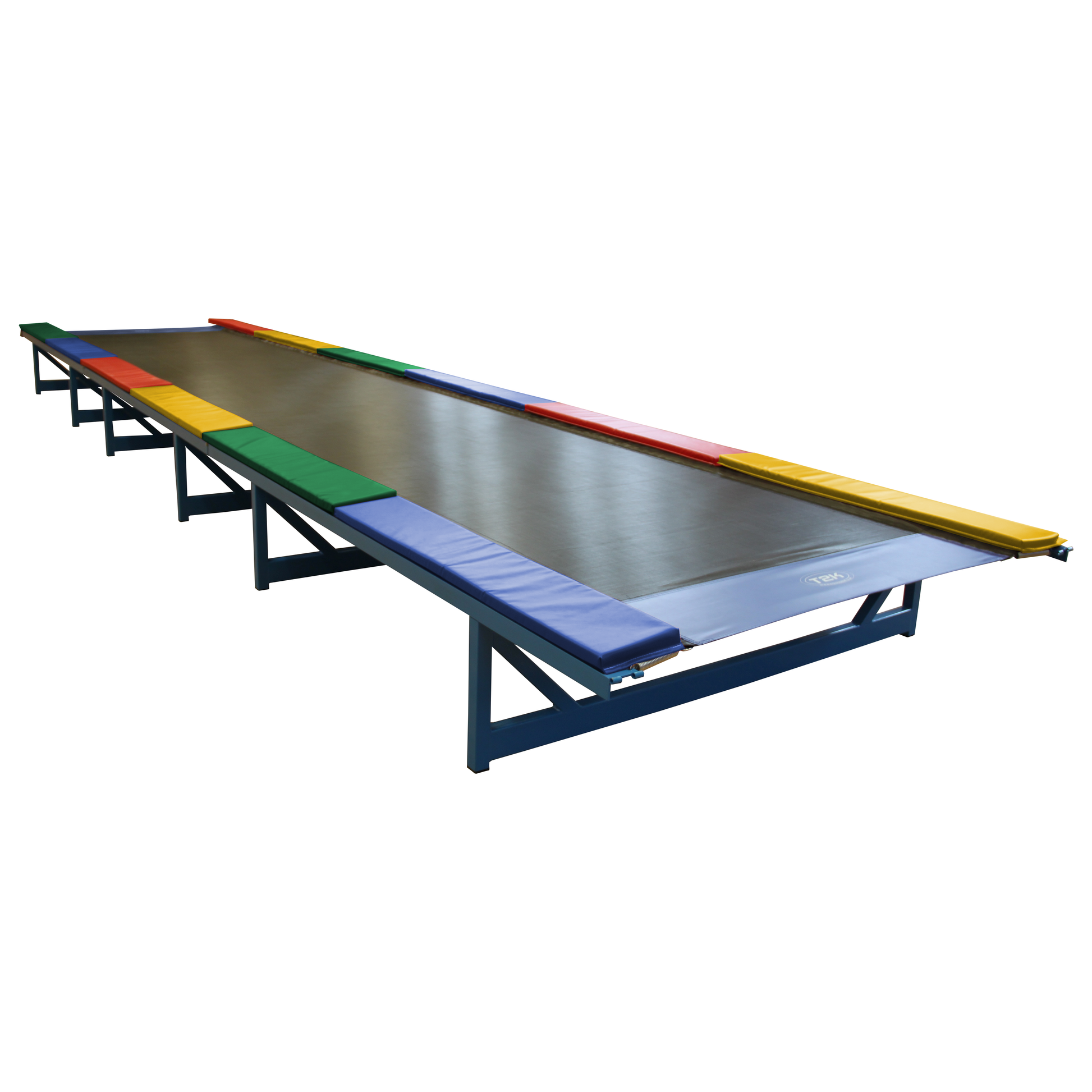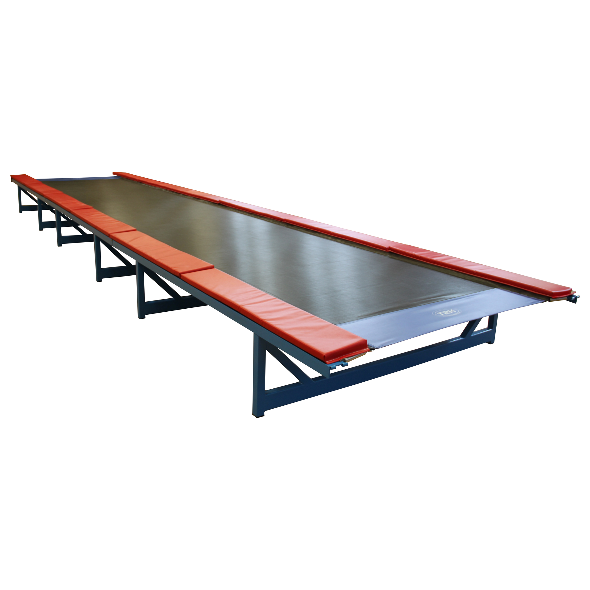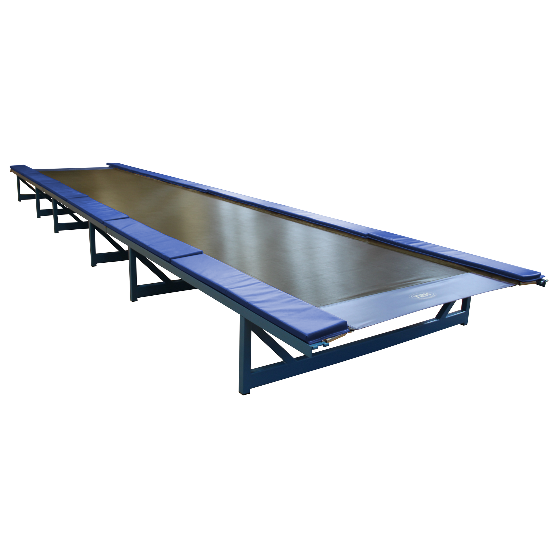Our fast track is a great training aid for practicing new tumble passes and for practicing over a long period of time, producing a rebound between a trampoline and a fibreglass track.